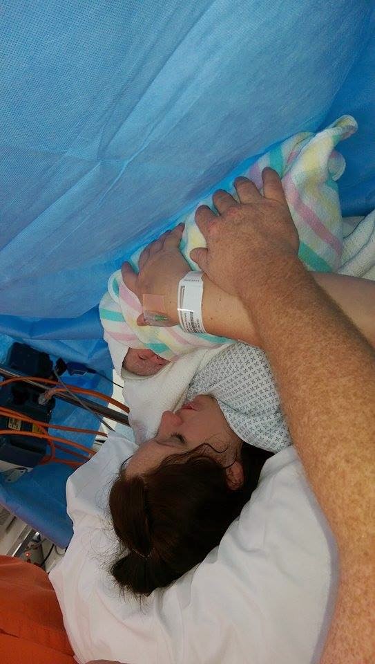 They couldn't pull her up very high because she had a very short cord, but we saw her. And she was beautiful, and tiny! And beautiful. I instantly fell in love. The first thing I said was "She looks like her brother, she's so beautiful! She's so little". They took her off, did her checks, and came back with her all bundled up. I had my first hold, but couldn't hold her for long because my face was itching like crazy I couldn't even hold her properly! Tim help onto her for most of the time with me having a little hold every now and then.